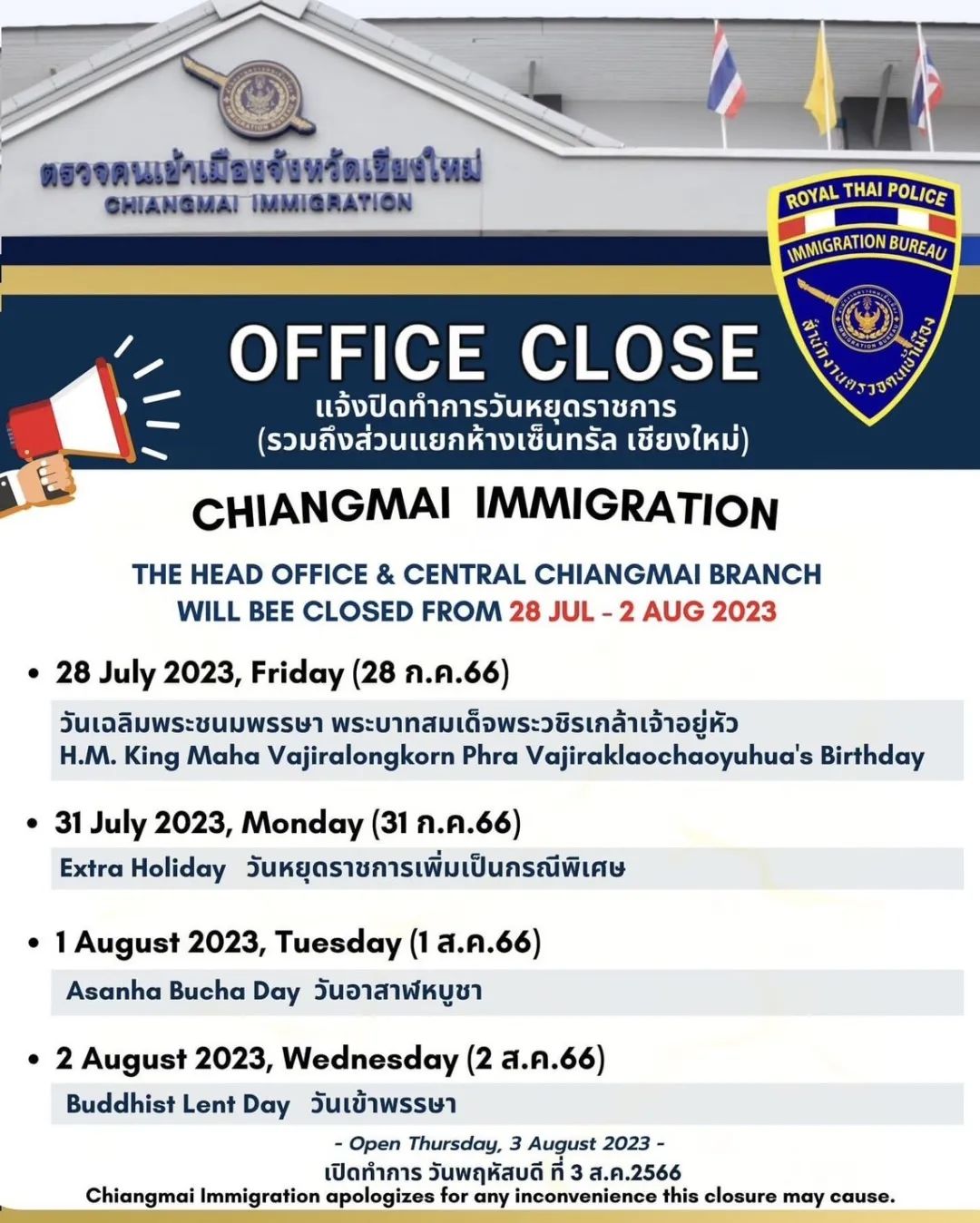 清迈移民局通知:7月28日至8月2日放假暂停办公!