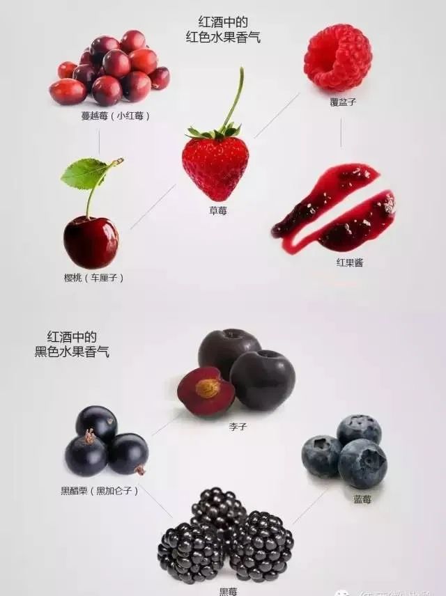 葡萄酒的果香绝对是饮用时的一大享受,而且果香还是盲品中识别葡萄酒最有力的依据,不过红白葡萄酒的果香不尽相同。通常红葡萄酒中会带有樱桃、黑莓、醋栗、覆盆子等红色水果或黑色水果的香味,而白葡萄酒中则带有桃子、柑橘、酸橙、葡萄柚等果香。