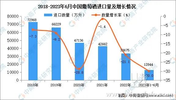 据中商产业研究院数据库显示,近几年,我国葡萄酒进口量呈下降趋势,进口量由2018年的72968万升减少到2022年的33675万升。最新数据显示,2023年1-6月中国葡萄酒进口量12844万升,同比下降30%。