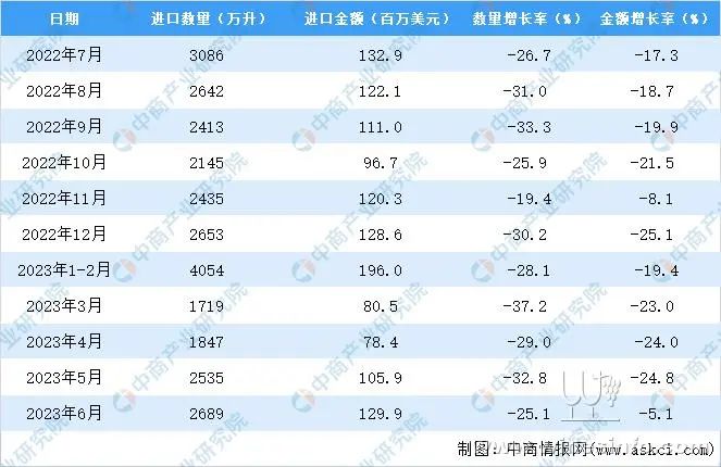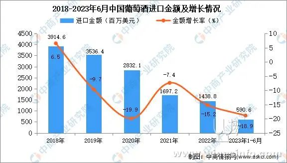 2023年1-6月中国葡萄酒进口量及金额增长情况