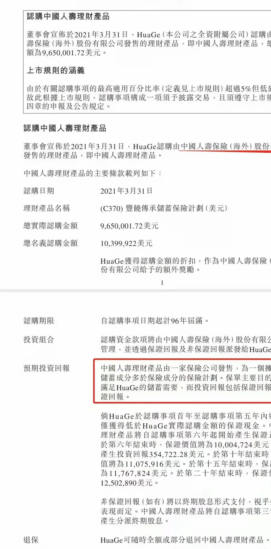 港交所上市公司旗下投资公司认购中国人寿海外版1000万美金的保险产品来满足自身储蓄需求。
