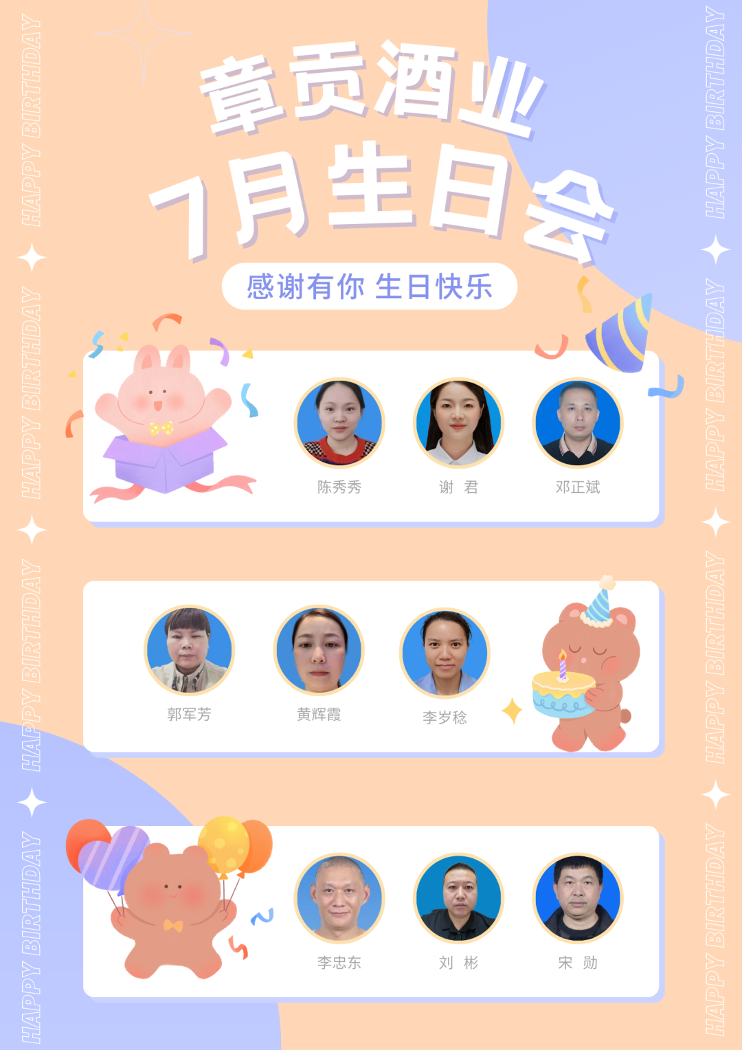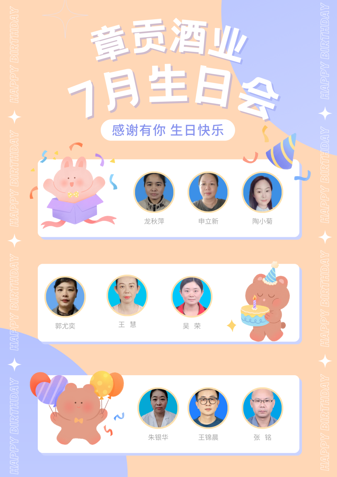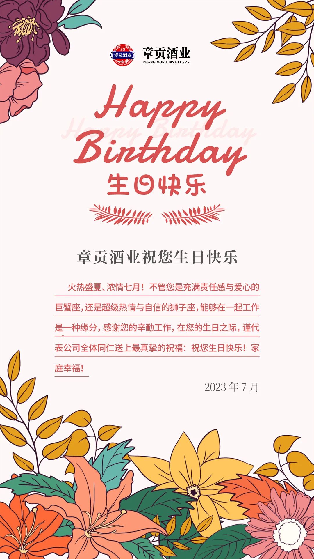 最后,再次祝福所有生日员工:生日快乐!生日是新的起点,是希望的开始,是梦想的引导!在这个特殊的日子里,愿章贡酒业的祝福和关怀伴随你一生,扬帆远航,祝你在今后的岁月中,事业腾飞、生活幸福美满!