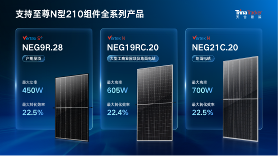 组件选型方面,天合至尊N型210系列组件是整个解决方案的核心。基于先进的210技术平台和N型i-TOPCon电池技术,新一代至尊N型组件具有高功率、高效率、高发电量及高可靠性四大优势。其中,新一代N型210R组件,采用了创新矩形电池片技术,具备尺寸和低电压优势,最高输出功率达605W,相比市面上一般N型组件,提升了约30W左右的功率,组件效率可以达到22.4%。这款组件非常适合地面电站及工商业分布式场景,能有效降低整个项目的度电成本,带来更高的投资回报率。