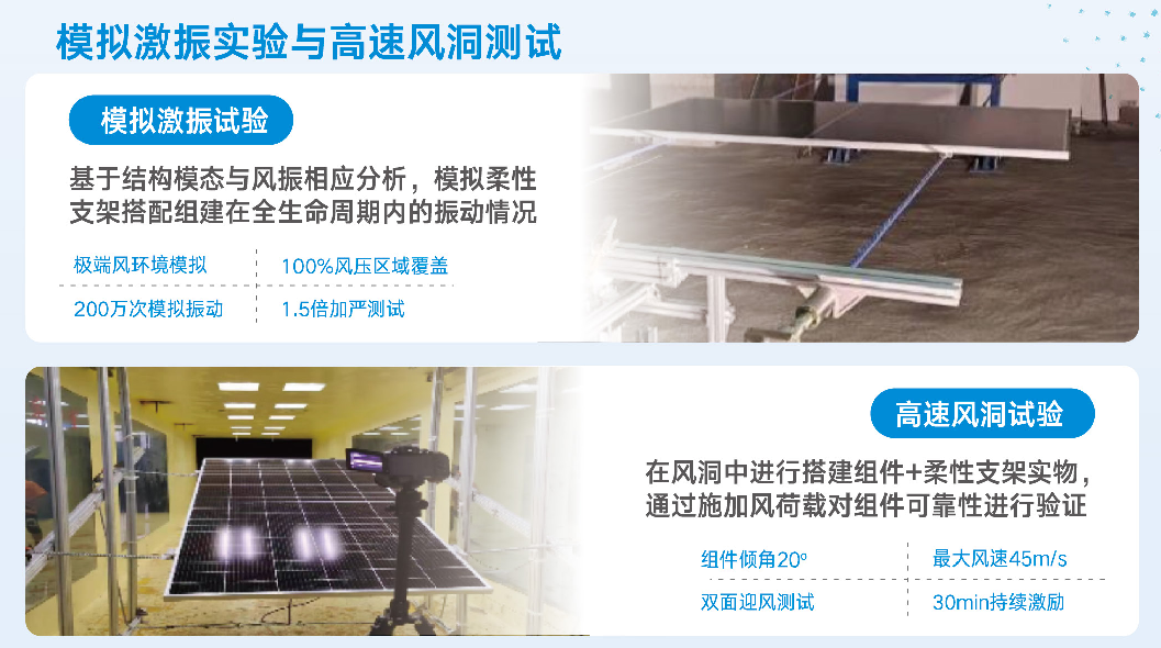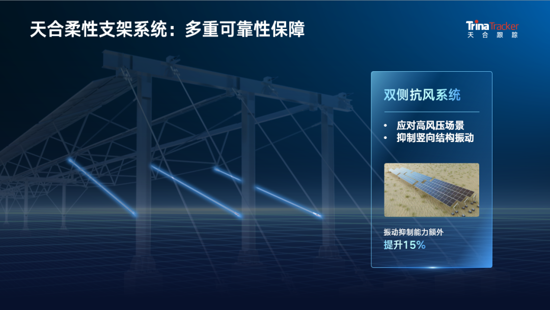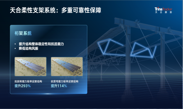 众所周知,桁架系统是提升柔性支架承载能力和抗风能力的关键。天合在设计桁架系统时对比了多项方案,最终选择从抗振动能力与抗扭转能力两个维度对桁架系统进行优化。测试结果显示,优化后的桁架系统提升了近100%抗振动能力,抗扭转能力也比单层索结构提升近300%,整体结构的稳定性和抗风能力得到了极大地提升,大大降低了组件失效的风险。