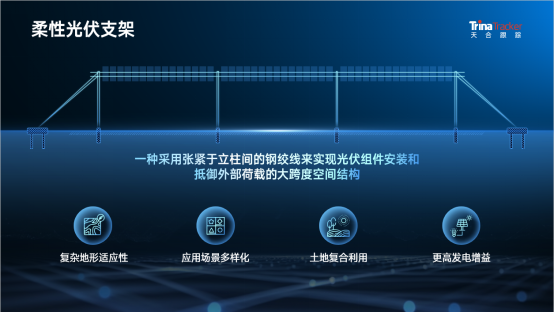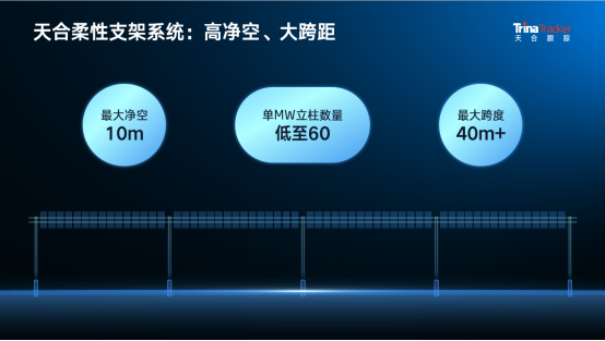 为此,天合光能基于双层索桁架结构打造天合柔性支架系统,实现最高10m的净空与超过40m的最大跨距,单MW基础桩数量低至60根,在简化项目设计的同时,有效降低了土建成本。