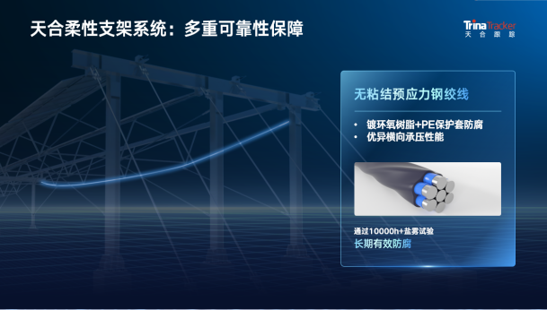 钢绞线是柔性支架区别于传统刚性支架的关键零部件,其选材和防腐方案直接影响到钢绞线的承载能力和防腐性能。天合柔性支架采用无粘结预应力钢绞线,拥有优异的抗扭转与横向承压能力,并通过渡环氧涂层与PE保护套作为防腐方案。与传统镀锌钢绞线相比,环氧涂层与PE保护套能通过10000小时以上盐雾实验,达到50年以上长期有效防腐。