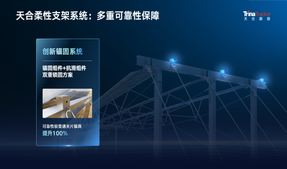 锚固系统关系到钢绞线安装的便捷性和与支架主体结构连接的可靠性,一旦锚具松脱将造成结构失效等安全问题。天合柔性支架系统升级了创新的双重锁固锚具,在夹片式锚具的基础上增加了抗滑组件来提升锚固节点的可靠性。在不影响原有施工便捷性的情况下,能够提升100%的可靠性。