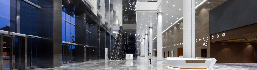 国际会议中心汉厅位于国博展馆中心区域,总建筑面积约5.6万平方米。整体建筑为三层结构,一层为主次门厅,共设八条连廊直抵各展馆,中间是 2800平方米的中央展厅,可承办大型展会的开幕式、精品展等;二层是多功能厅,提供会议及演出场所,能容纳观众 2300 余人,并配套设置会议室、接待室、休息室、化妆间等,三层是多功能厅楼座和配套会议室。