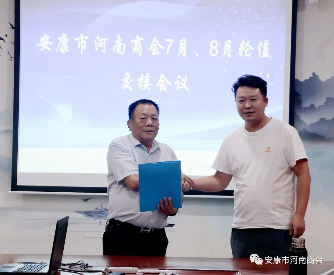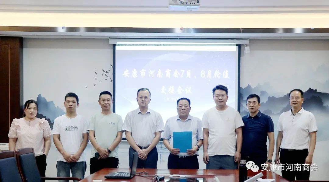 7月26日,安康市河南商会召开了7月—8月轮值交接会议。监事长孟宗伟、副会长崔新田、理事王灿、黄玉琢、7月及8月轮值小组成员、陕西宁康律师事务所副主任潘小军、副秘书长王远正等参加了会议。会议由副秘书长王远正主持。