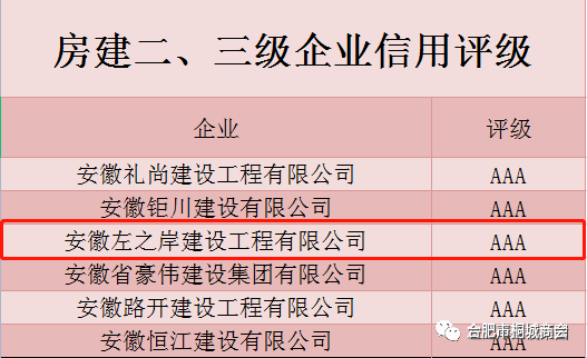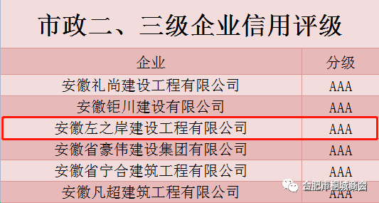 七月飞歌传喜讯,荣誉榜上添新篇!近日,合肥城乡建设局公布2023年第一次合肥市施工总承包、装饰、监理企业信用综合评价结果。商会常务理事单位安徽左之岸建设工程有限公司凭借良好的信用记录和合同履约能力脱颖而出,荣获房建AAA、市政AAA、装饰AAA信用评级!不忘初心,方得始终。获得AAA级信用评级对于商会常务理事单位安徽左之岸建设工程有限公司而言,是认可,亦是鞭策。下一步,商会常务理事单位安徽左之岸建设工程有限公司将再接再厉,不断加强信用体系建设,为企业及行业的健康可持续发展作出更大的贡献。(安徽左之岸建设工程有限公司)