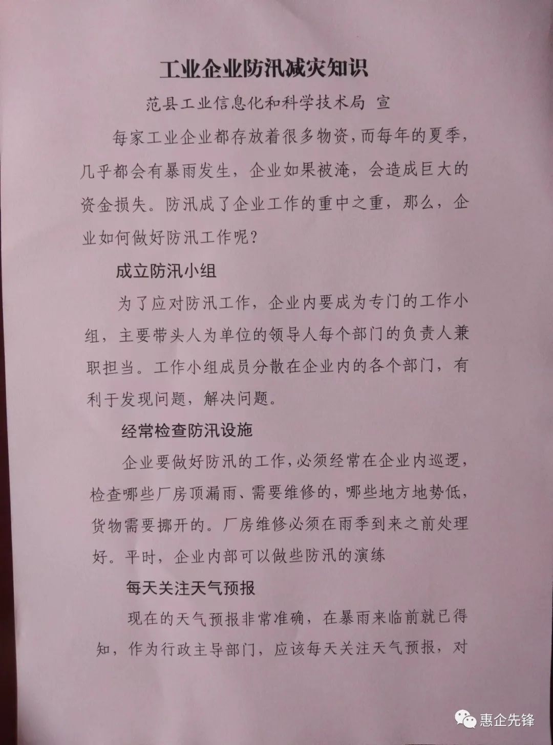 二、加大宣传力度,提升防汛意识。密切关注汛期动态,通过“范县政企通”微信群及时将汛情及重要天气预警信息及时转发给企业,让有关企业及时掌握当前防汛形势并做好充分准备。同时,组织领导干部深入有关企业大力宣传《企业汛期安全防护指南》、《企业如何做好防汛》等防汛安全知识,现场发放防汛知识80余份,向企业普及防汛抢险、汛期避险及自救互救等知识,不断增强了企业主动防汛意识和自救逃生能力。