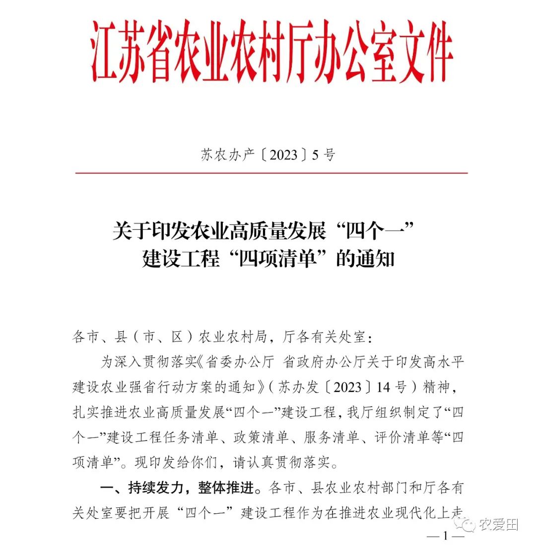 今年以来,江苏启动实施农业高质量发展“四个一”建设工程,即1000个农业农村重大项目、1000个新型主体领头雁、100个农产品和农业服务业品牌名牌、100个农业农村高质量发展载体平台。省委办公厅、省政府办公厅近日印发《高水平建设农业强省行动方案》,进一步把“路线图”细化为“施工图”“责任表”。