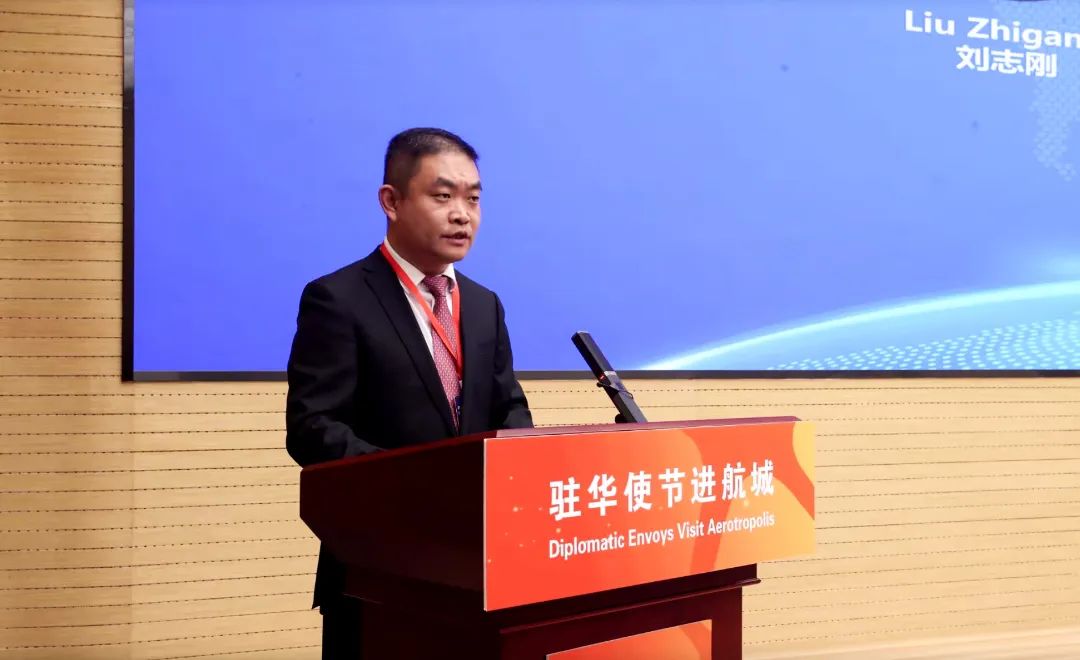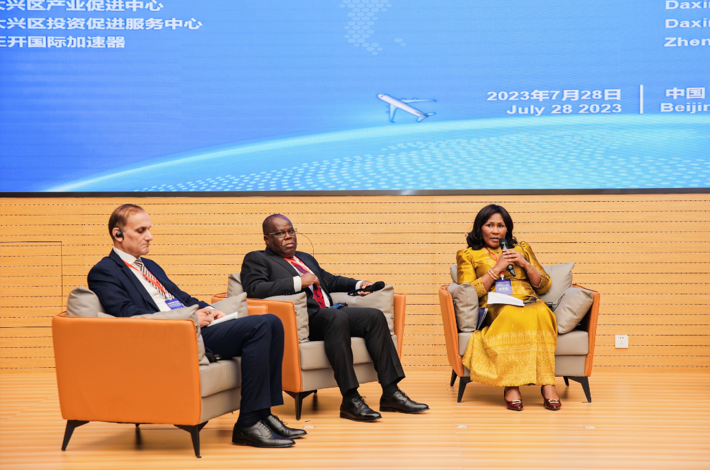 7月28日,驻华使节进航城暨亚非经贸合作洽谈会在临空区举办。埃塞俄比亚驻华大使馆大使塔费拉·德贝·伊马姆、贝宁共和国驻华大使馆大使西蒙·阿多韦兰德、加纳共和国驻华大使馆副馆长奥乌苏·阿菲耶等20多个亚非国家驻华使节走进临空区,见证驱动未来的世界航空城,感受依托大兴国际机场这一发展新的动力源的蓬勃生机。北京新航城控股有限公司党委书记、董事长刘志刚参加活动并致辞。