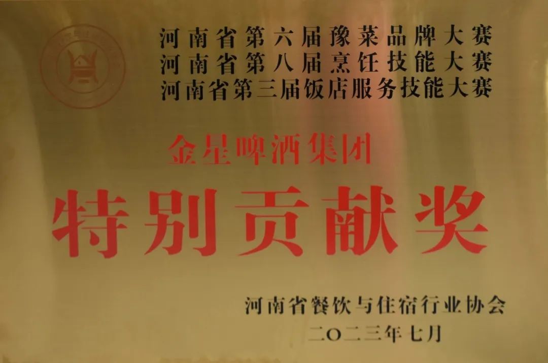 金星啤酒携手河南省餐住协共同策划多项专项活动,对本次省餐住协“三项大赛”大力支持,积极打造“餐酒融合”新模式,特此,河南省餐住协为金星啤酒集团颁发了“特别贡献奖”。