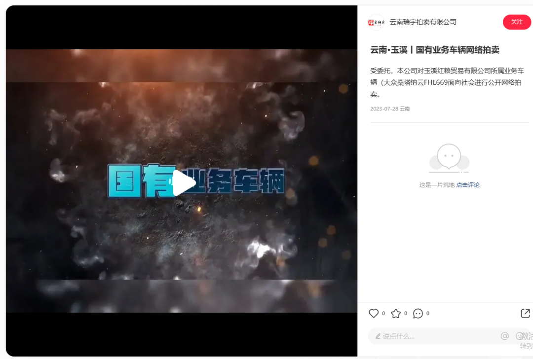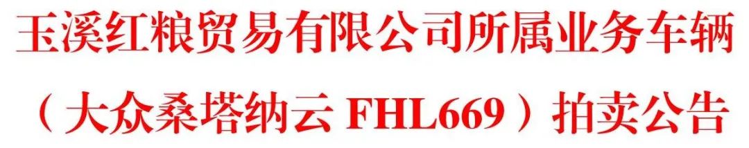 依据《中华人民共和国拍卖法》《中华人民共和国民法典》及相关法律、法规的规定,玉溪红粮贸易有限公司(以下简称委托方)委托云南瑞宇拍卖有限公司(以下简称本公司)对玉溪红粮贸易有限公司所属业务车辆(大众桑塔纳云FHL669)(以下简称标的)面向社会进行公开拍卖。