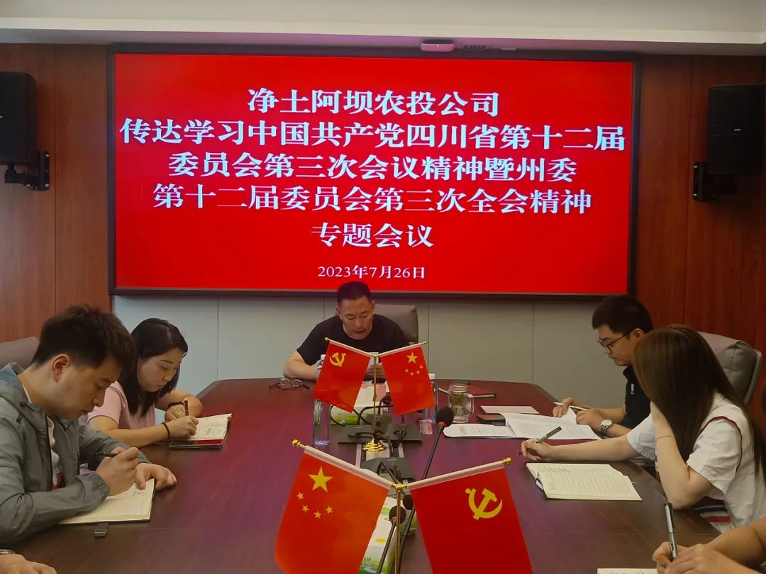 会议强调,学习贯彻中国共产党四川省第十二届委员会第三次全体会议精神暨州委第十二届委员会第三次全会精神,是当前和今后一个时期的重要政治任务。各部门、下属企业要迅速组织传达学习,把省委州委的全会精神与农投的实际工作相结合起来,真正在学懂弄通做实上下功夫,为阿坝高质量发展贡献农投力量。一是做响“净土阿坝”品牌。做强做大“净土阿坝”品牌联盟,提档升级“净土阿坝”品牌视觉形象,着力打造“净土阿坝”品牌产品体系,加快推进“6+N”产业延链增效。并通过各类宣传媒体,加大对“净土阿坝”品牌的宣传力度。二是做优“净土阿坝”产业。围绕主责主业建产业、增效益,突出“6+N”特色产业,深化对外合作。全力推进高原特色水果优产区、优质高山蔬菜生产基地、乡土牧草、汶川雪花牛、红原标准化牦牛养殖示范基地。三是做强“净土阿坝”后劲。按照“以为农服务为中心开展生产经营活动”的工作导向,围绕“搭台、兴业、造血、优治、聚才”的发展思路,全力以赴抓项目、塑品牌、强销售、促改革,奋力夺取最优战果,奋力创造最佳效益,为全州“一州两区三家园”建设展现农投风采,贡献农投力量。