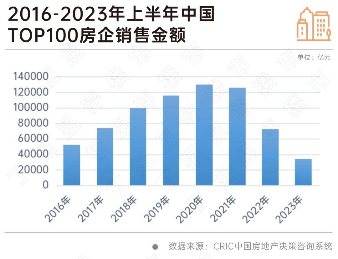 2020年和2021年,有43家“千亿房企”。到了2022年,这个数量直接下降至20家。不仅如此,从2016年至2023年百强房企销售金额对比来看,2023年上半年TOP100房企的销售34563亿元,低于2016年同期。由此可见,今年房企压力仍然较大。