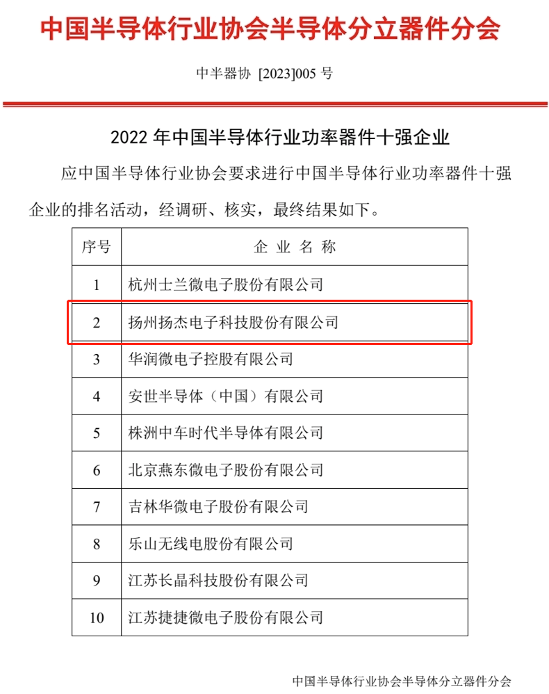 1,中国半导体行业协会公布了2022年中国半导体行业功率器件十强企业名单