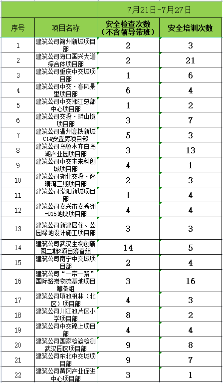 7月21日-7月27日(数据统计截至7月27日17:00),各项目平安二航项目安全管理系统使用情况如下: