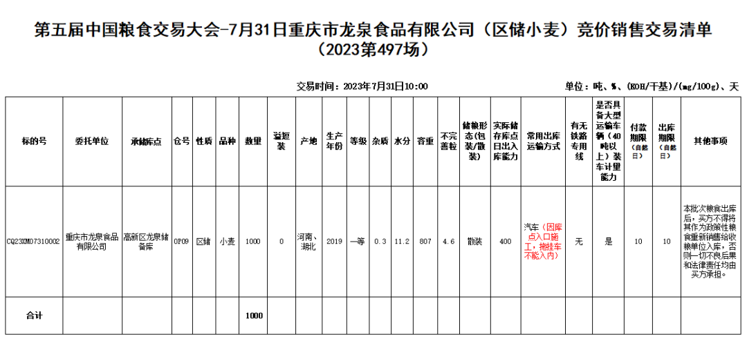 受重庆市龙泉食品有限公司委托,重庆市粮油批发市场有限责任公司(即国家粮食重庆交易中心,以下简称“批发市场”)定于2023年7月31日10:00举办龙泉食品公司(区储小麦)竞价销售交易会,现将有关事项公告如下: