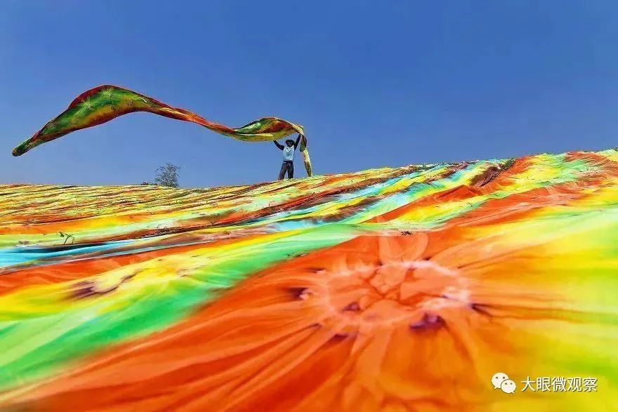 五颜六色的布料,在染色后,需要烘干。