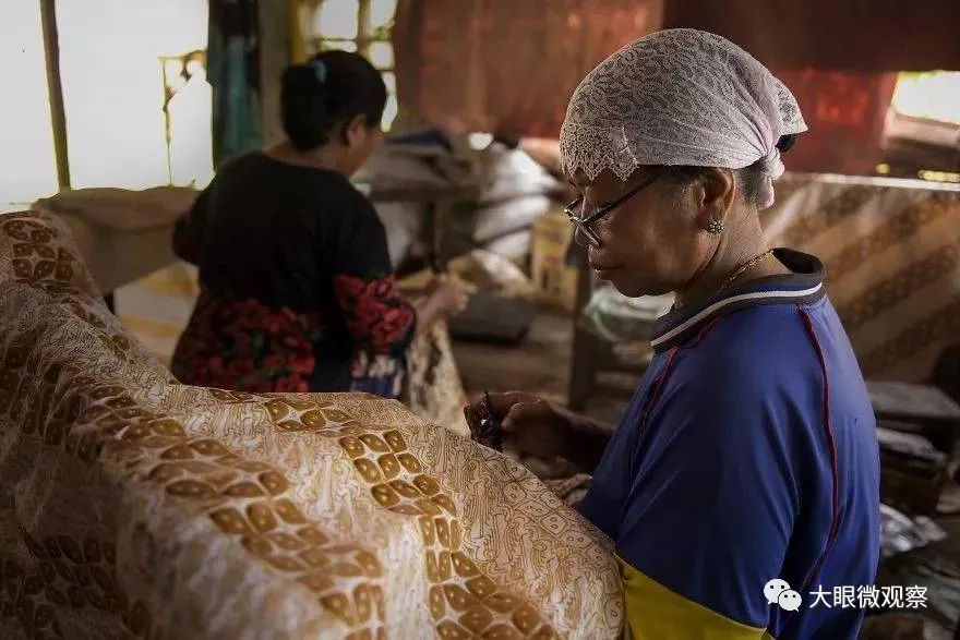 蜡染是用蜡刀蘸熔蜡,绘画于布后以蓝靛浸染,既染去蜡,布面就呈现出蓝底白花或白底蓝花的多种图案。