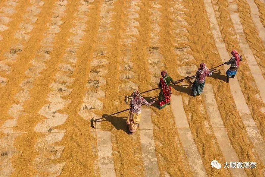 图中是一群收获稻谷后,在晒稻子的农民。