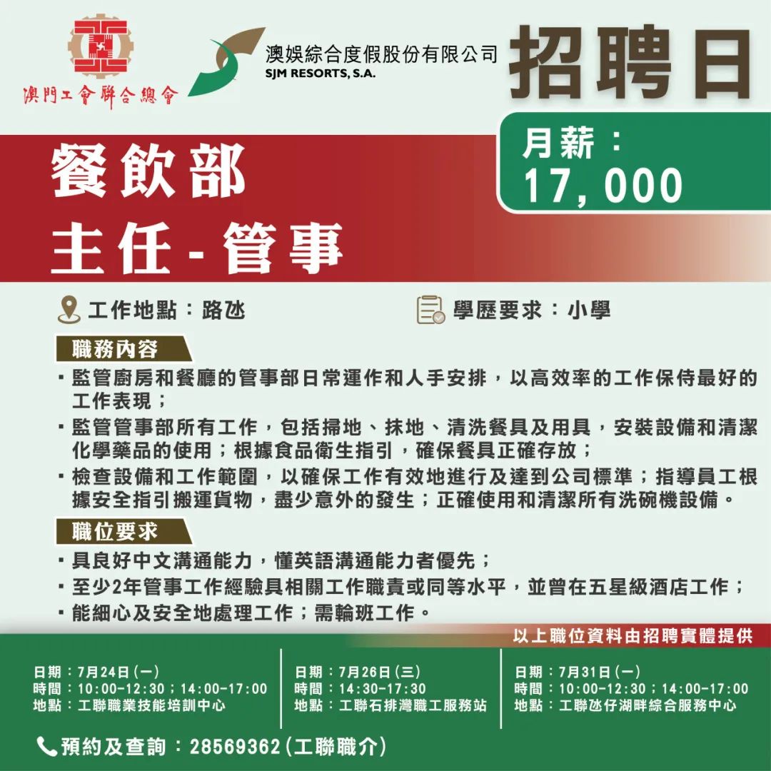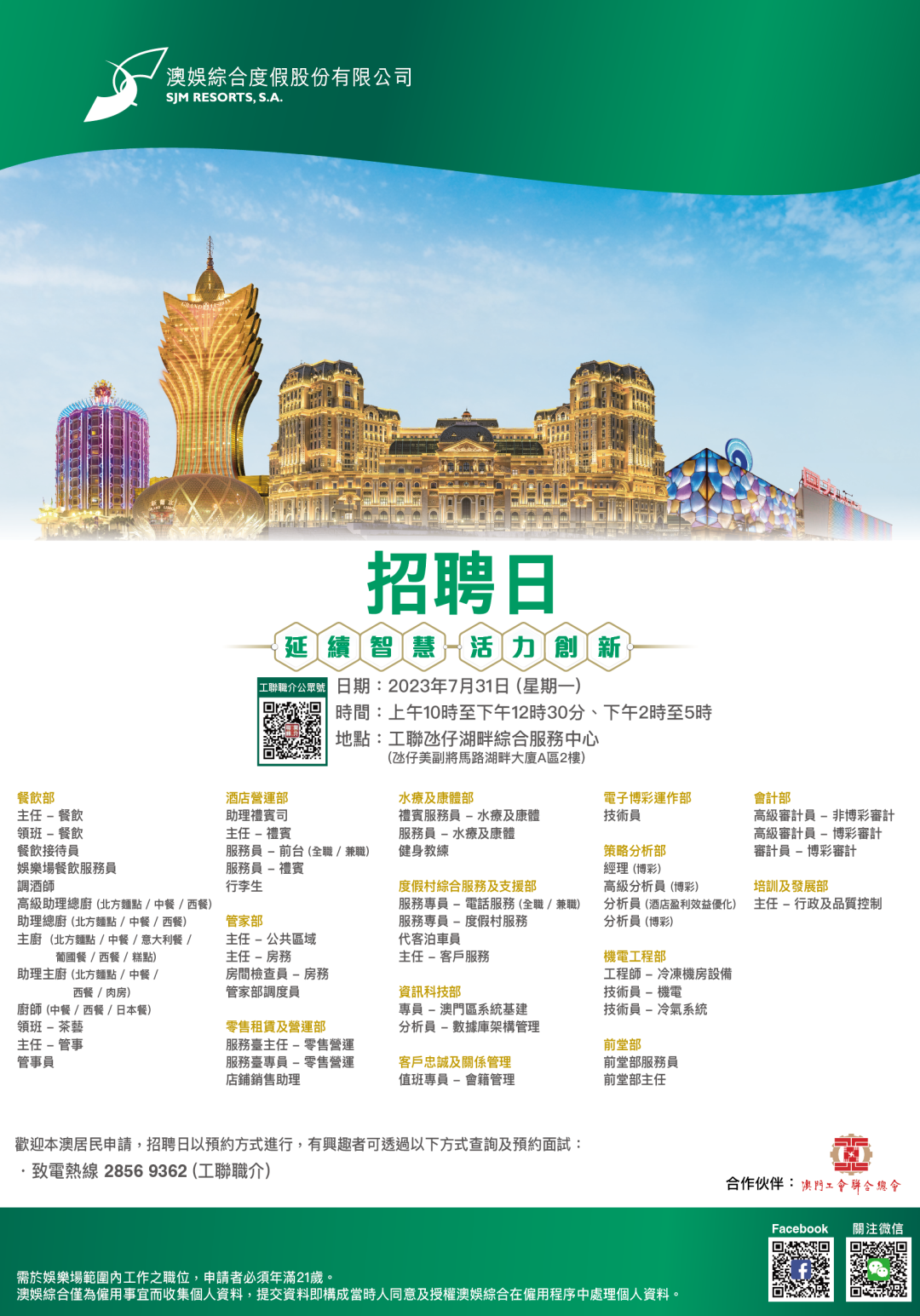 本場招聘日將提供餐飲部、酒店營運部、管家部、零售租賃及營運部、度假村綜合服務及支援部、水療及康體部、機電工程部,前堂部等多個部門職缺!