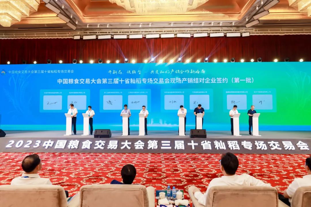 2023年7月25日,由国家粮食交易中心指导,赣、浙、闽、粤、湘、鄂、皖、桂、贵、滇十省交易中心承办的中国粮食交易大会第三届十省籼稻专场交易会在江西南昌举行。粮食集团董事长王小彬代表粮食集团出席活动并与江西省抚州市属粮食有限公司代表签订产销结对意向书,取得丰硕成果。