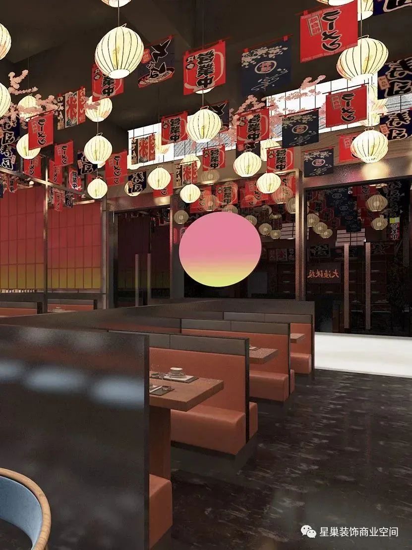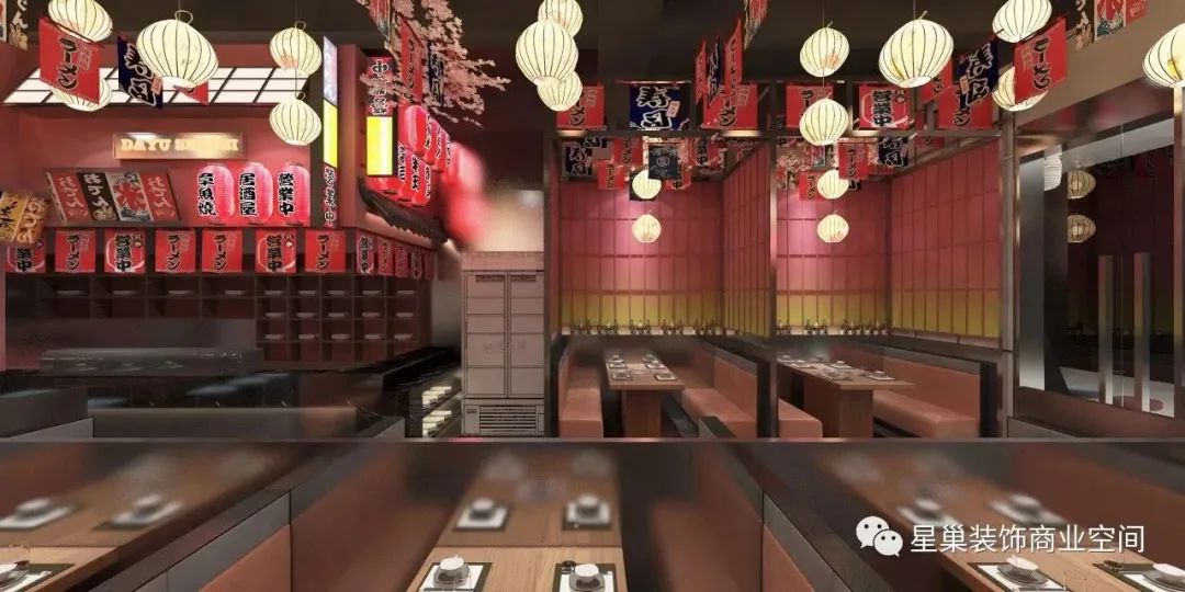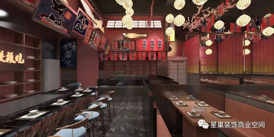 为了还原日式料理店的既视感,设计师将等位区紧邻门头,布置与室内卡座相呼应,挂上日式灯笼和隔断帘,致景让食客从进门就有东京式的沉浸感。
