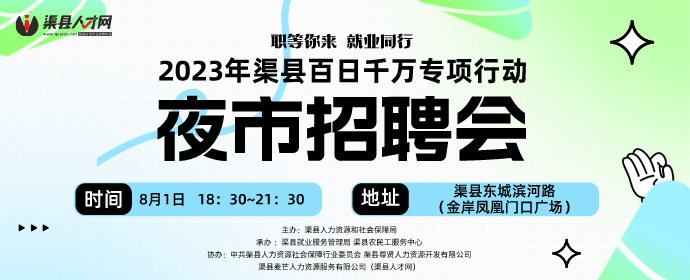 为全面贯彻落实党的二十大精神和党中央国务院、省委省政府、市委市政府关于稳就业保就业决策部署,进一步健全就业公共服务体系,促进高校毕业生等重点群体高质量就业,充分满足全县企业日益增长的用工需求汇聚人才力量和提供智力支撑。根据《四川省人力资源社会保障厅关于开展2023年全省公共就业服务专项活动的通知》(川人社函〔2023〕14号)《达州市人力资源和社会保障局关于开展2023年全市公共就业服务十大专项活动的通知》(达人社函〔2023〕30号)文件要求及我县就业工作安排,我局将于8月1日在渠县东城滨河路(金岸凤凰门口广场)举办2023年渠县“百日千万专项行动”夜市招聘会活动,以充分满足全县企业日益增长的用工需求,亦为渠县经济社会高质量汇聚人才力量和提供智力支撑。