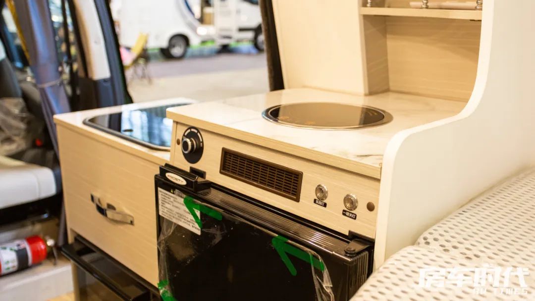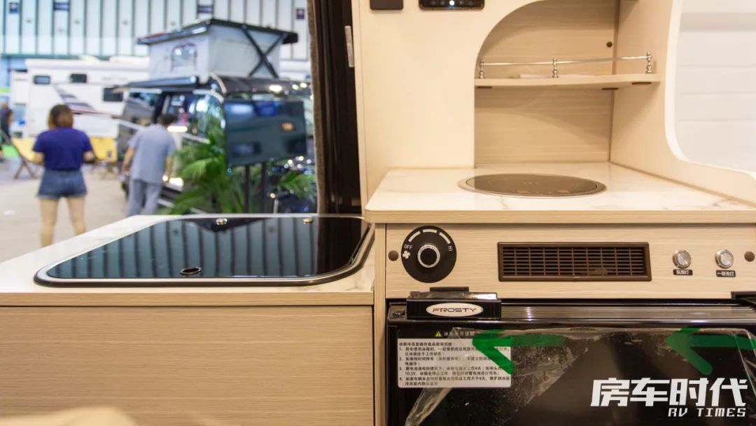 进门处为厨房区,料理台面配备有洗菜池、电磁炉,台面下方配备有微波炉、储物柜,储藏柜可以存放各种调料和厨具,保持车内整洁有序。在厨房区一侧配有双开门房车专用冰箱 85L(22L独立冷冻室),可分区冷藏冷冻食物,夏季炎热,车友还可以在此冷藏一些冷饮。