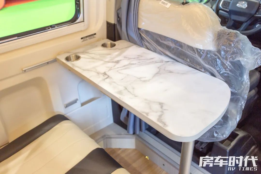 会客区采用了双人卡座的设计,为乘坐者腿部留有宽敞的空间。座椅采用优质皮料包覆,乘坐舒适。卡座前方配备可折叠餐桌,车友可以在此办公或用餐等。