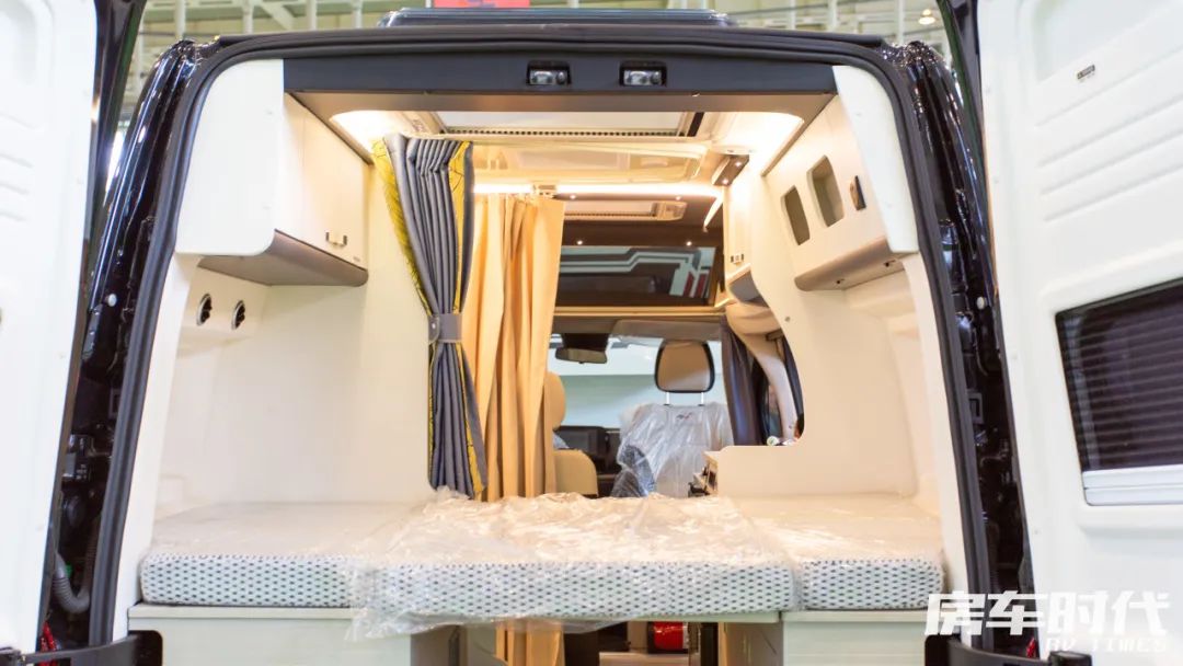 尾部休息区采用横置床设计,床铺尺寸为1850×1200mm,可以容纳双人休憩。另外床铺下方设计了一个贯通的储物空间,宽敞实用,车友可以在此存放旅途所需的大件行李。