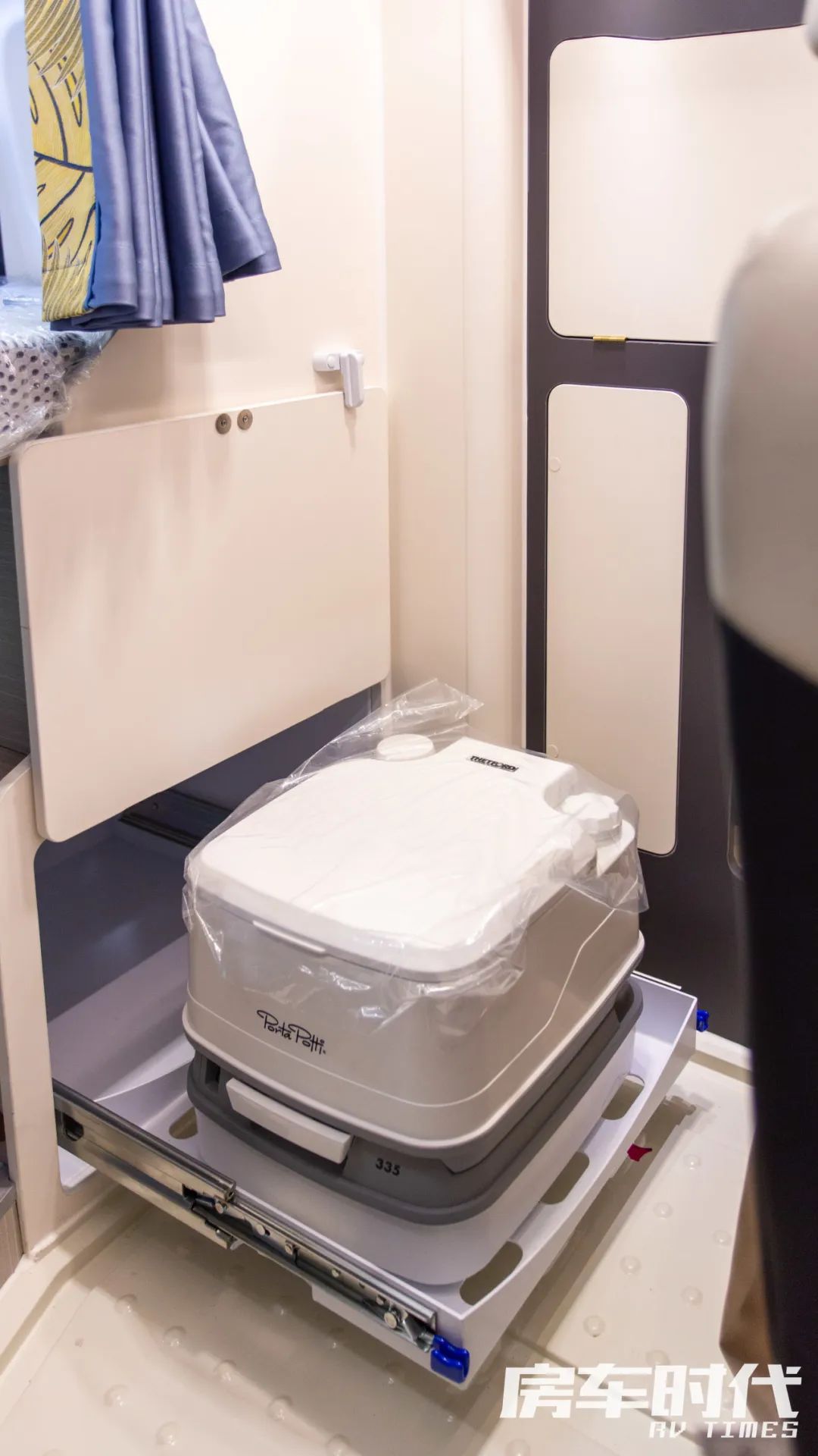 卫生间采用卷帘门隐藏式设计,虽然不是独立式卫生间,但是这样设计可以无形中增大生活区使用面积,后期也便于清理打扫。卫生间内部配备有洗手盆、淋浴、抽拉式便携坐便器等设备,满足基本洗漱需求。水电配置方面,本车标配75L清水箱、40L灰水箱、460Ah锂电池、3000W充逆变一体机、12V底置空调及伟巴斯特燃油暖风热水一体机等。