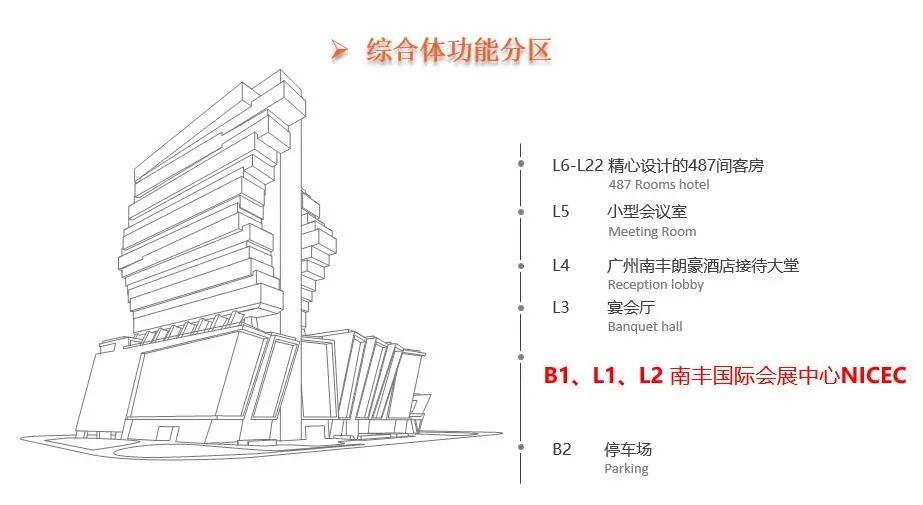 负二层为地下停车场,负一层、一层、二层为大型展厅。三层为2800㎡无柱大型宴会厅及790㎡宴会厅,四层为南丰朗豪酒店大堂,5层至22层包含小型会议室及酒店住房。