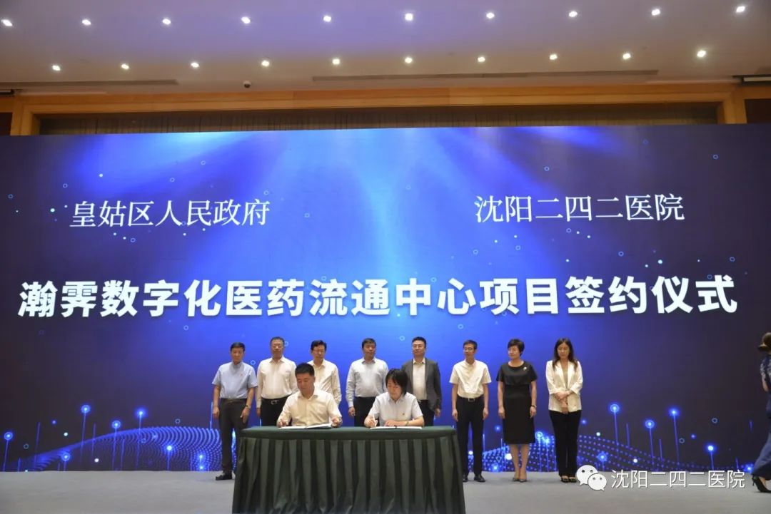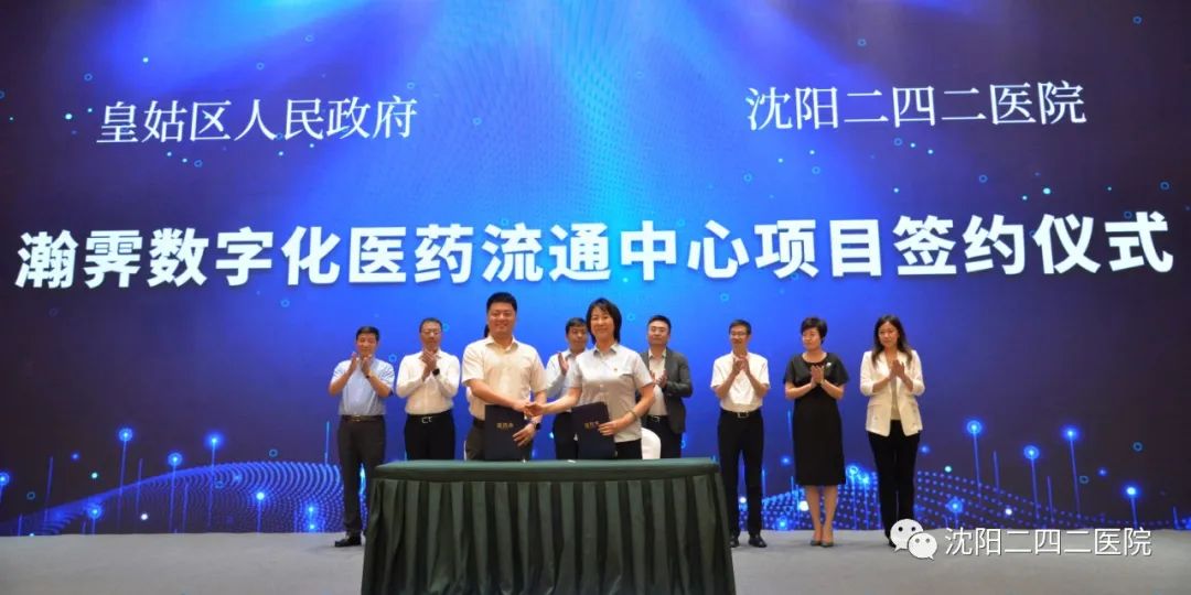会上我院与皇姑区人民政府签约了二四二瀚霁数字化医药流通中心项目。王向东院长与市、区重要领导上台助签,见证签约过程。