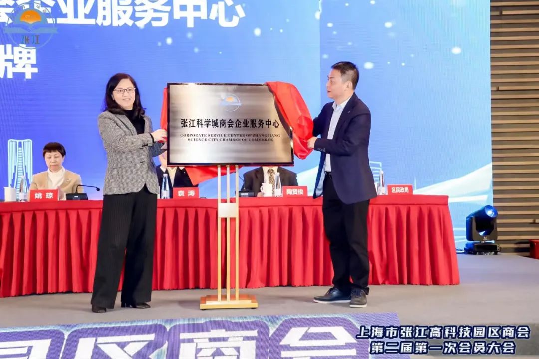 张江管理局副局长吴俊,浦东新区民政局社会组织管理处处长李红为“张江科学城商会企业服务中心”揭牌。