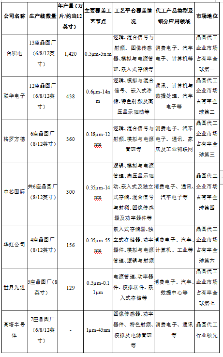 行业内主要竞争公司在生产线数量及产量、工艺节点、所覆盖的工艺平台及先进性水平、代工产品类型、市场地位等方面的比较情况如下: