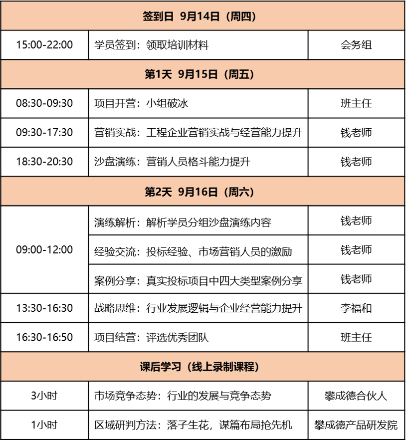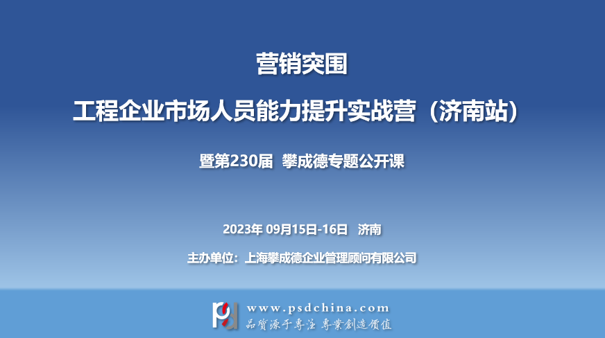 攀成德携手国内优秀工程企业中具有丰富实战经验的营销专家,聚焦市场经营能力提升的关键环节和痛点问题,开展2天封闭式实战特训营,帮助市场经营人员重新构建正确的营销观念、掌握科学合理且实用的营销动作,帮助企业在市场的夹缝中韧性生存,让每一个营销组织都成为企业增长的发动机!