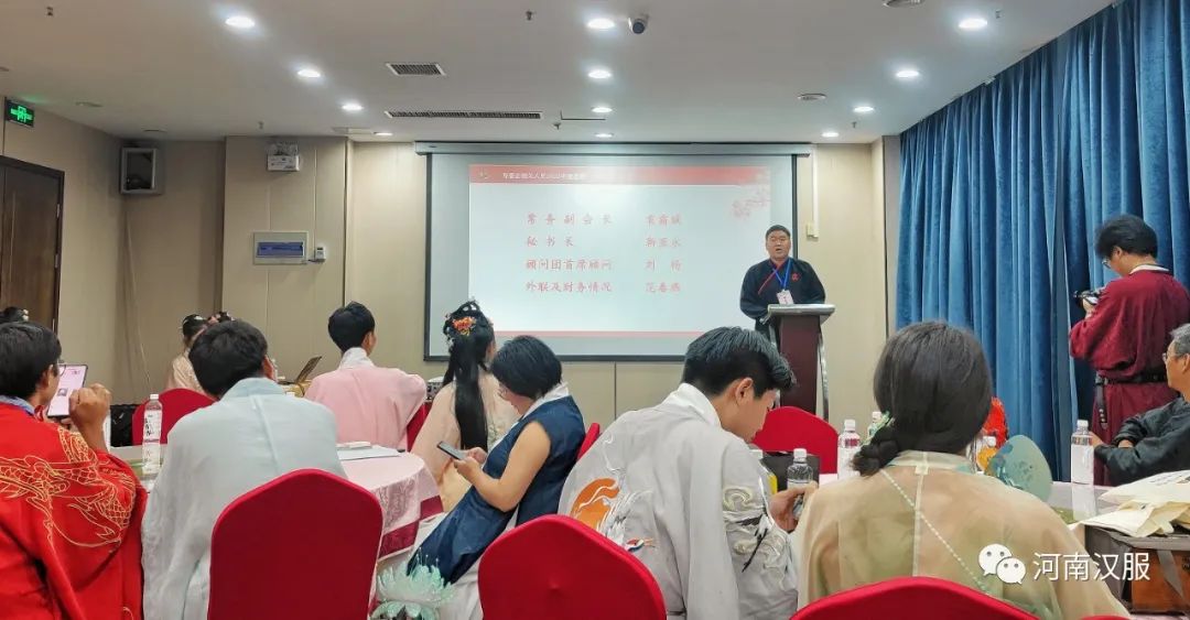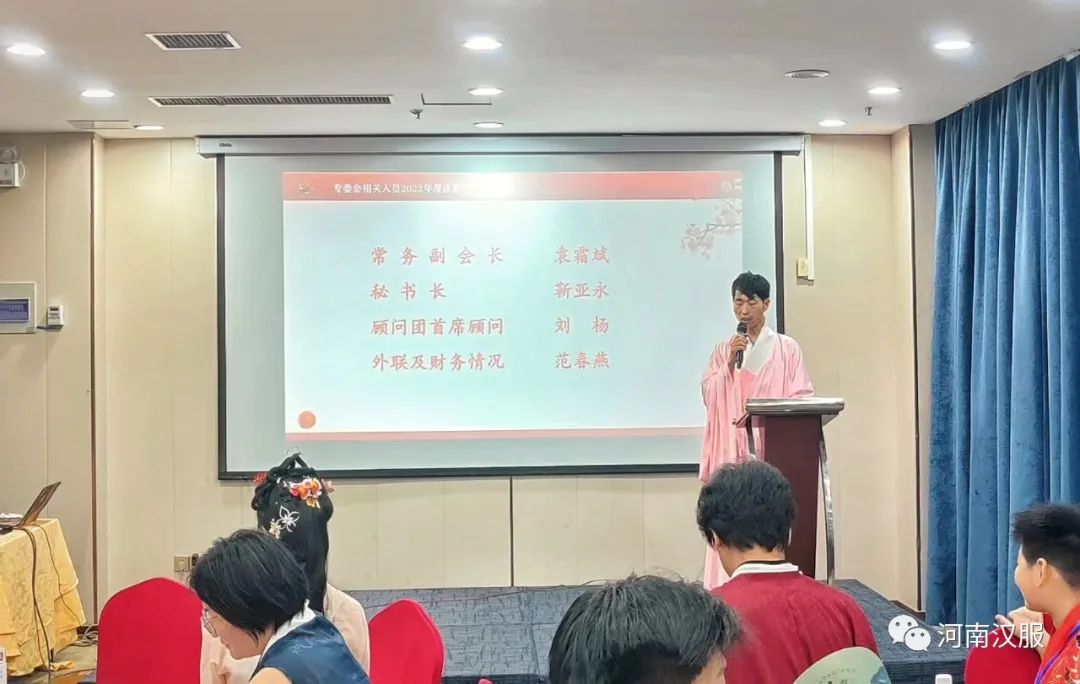 岂曰无衣,与子同袍!2023年7月29日,第二届河南省服装行业协会汉服专业委员会年会庆典活动在河南省郑州市中弘国际酒店成功举办。河南省服装行业协会汉服专业委员会常务副会长袁霜斌,秘书长靳亚永,顾问刘杨、渠水秀,副秘书长曹世杰、李杰、崔高敏、张卫猛、吴振峰、张筝歌、张芳志等及60余名会员代表共同出席了本次年会。