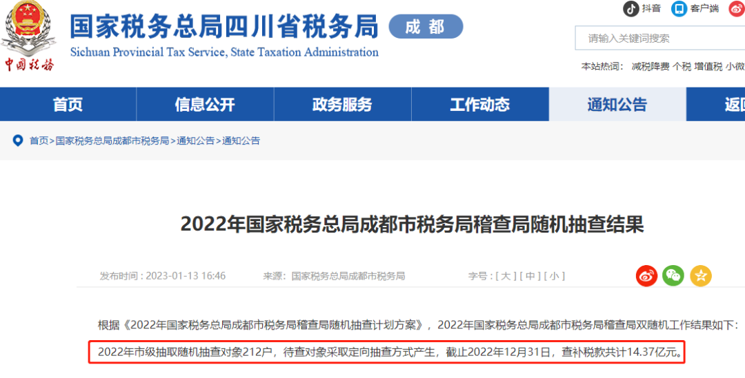 2023年的税务稽查力度有多大?我们来看看最新消息:2、成都稽查局抽查212户,查补税款14.37亿元3、江西稽查局下发通知,将400户纳税人列入重点稽查对象《通知》中明确:对于纳税人涉嫌偷逃骗抗税和虚开发票等违法行为,要经由下级稽查局上报上级稽查局进行处理。02