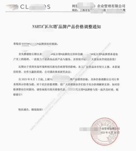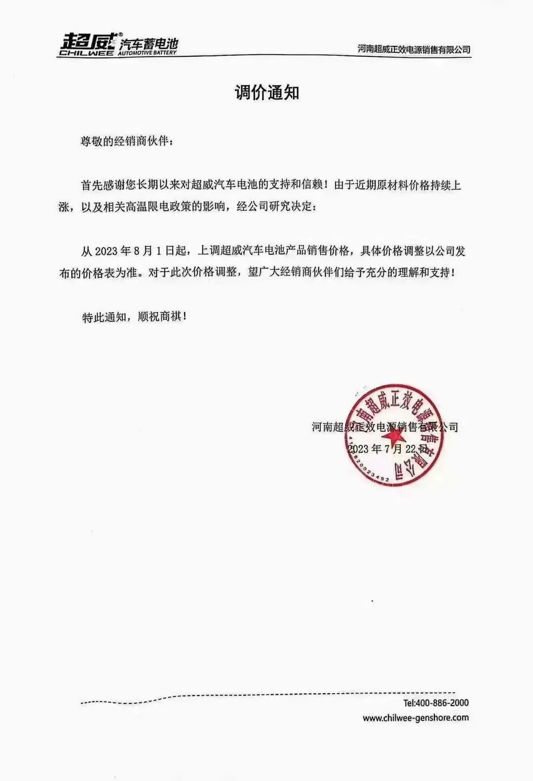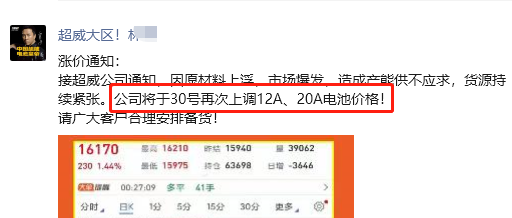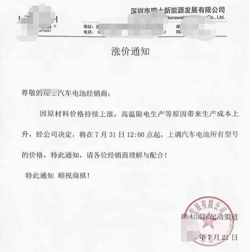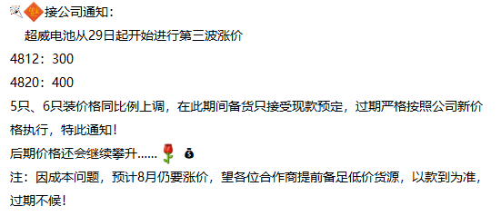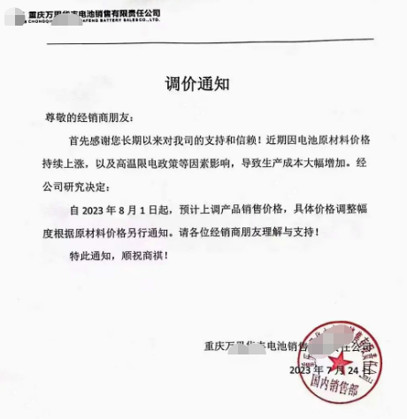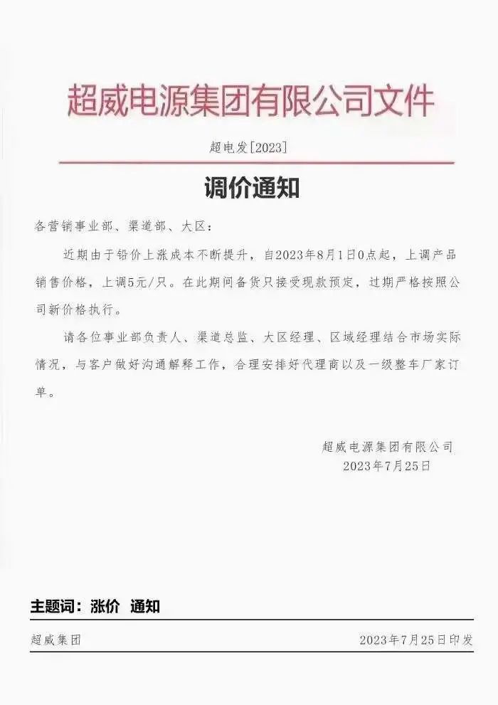 如超威电池通知上称:近期由于铅价上涨成本不断提升,自2023年8月1日0点起,上调产品销售价格,上调5元/只。在此期问备货只接受现款预定,过期严格按照公司新价格执行。