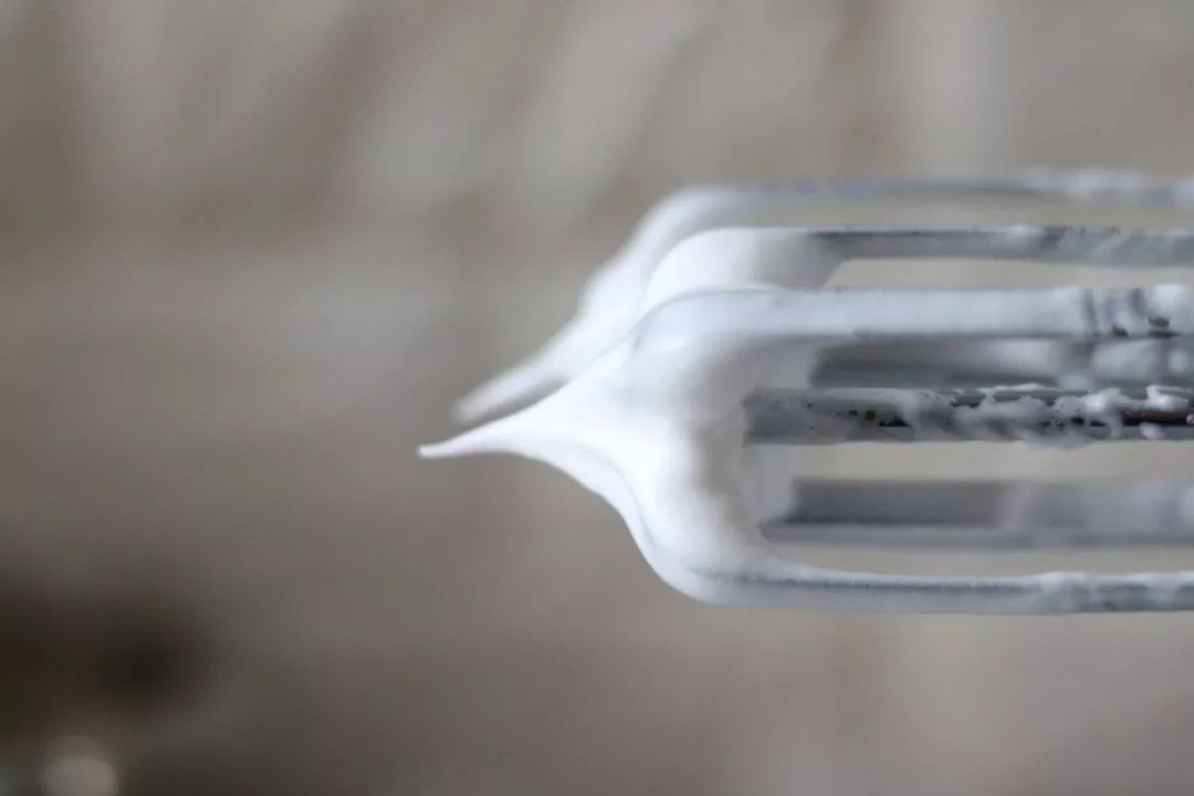 蛋白分三次加入40g糖,打发至硬性发泡;
