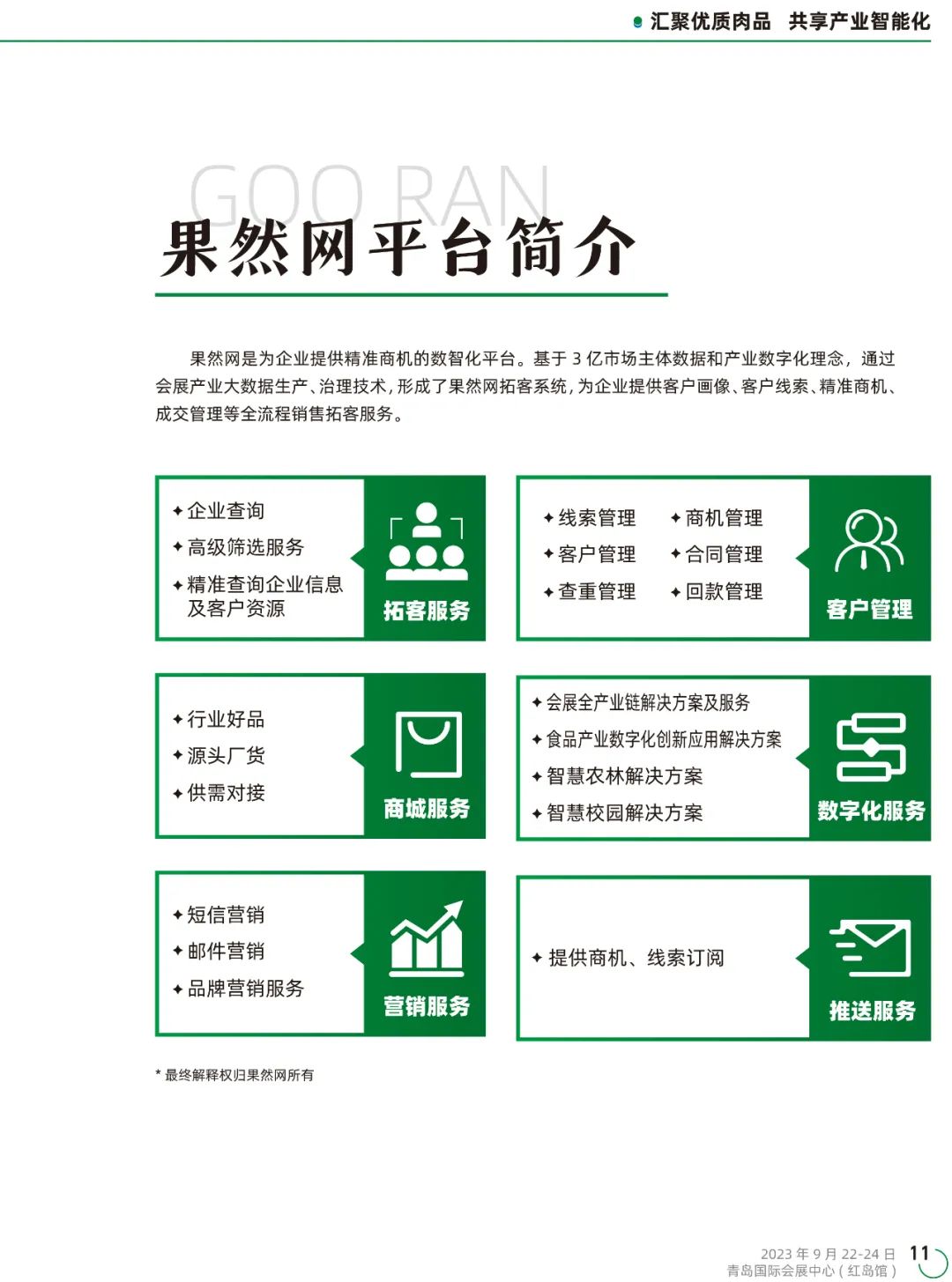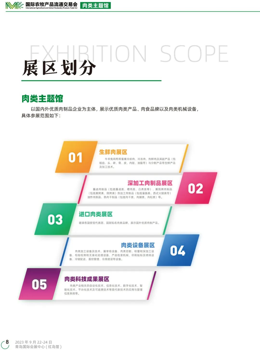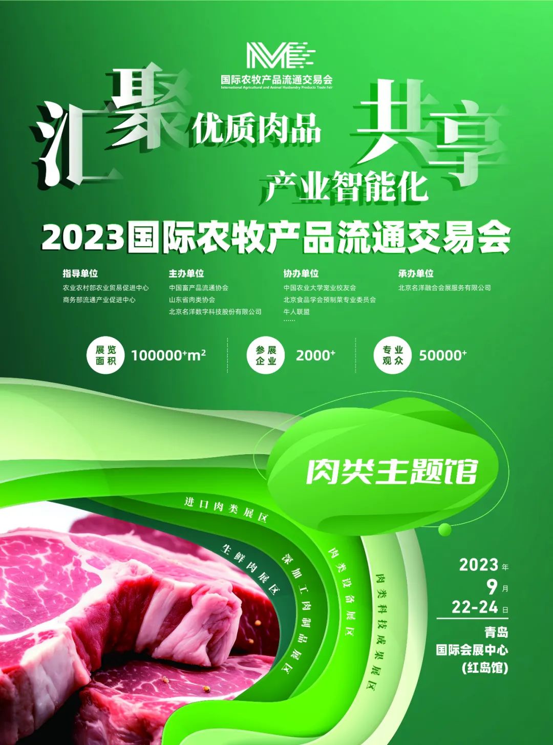 由农业农村部农业贸易促进中心、商务部流通产业促进中心指导,中国畜产品流通协会、山东省肉类协会、北京名洋数字科技股份有限公司主办,中国农业大学宠业校友会、北京食品学会预制菜专业委员会、牛人联盟协办,北京名洋融合会展服务有限公司承办的“国际农牧产品流通交易会”将于 2023 年 9 月 22-24 日在青岛国际会展中心 ( 红岛馆 ) 举办。