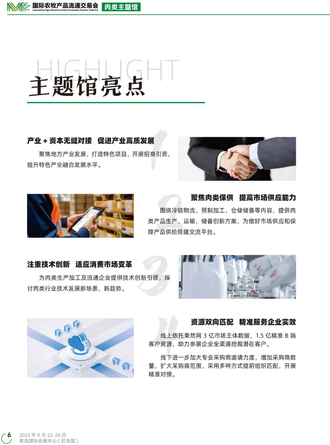 为扩大内需战略和提升品质消费,大会设立肉类主题馆,加快推广肉产品新成果新成就,进一步完善产业链、供应链,提升服务链、价值链,助力企业树品牌立形象,推动优质肉产品高效流通、产销有效衔接,为现代肉类产业高质量发展注入新动能。
