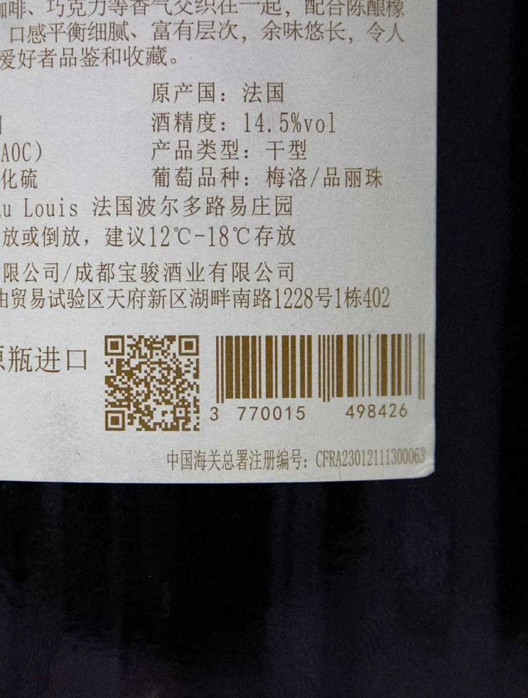酒瓶的标签之上,通常包括了酒庄的名称,酒的名字,葡萄酒的品种,酒的容量、酒精度、出产国和出产年份等,对于懂酒的人来说,年份十分重要,往往一瓶好的红酒一定产于好的年份。