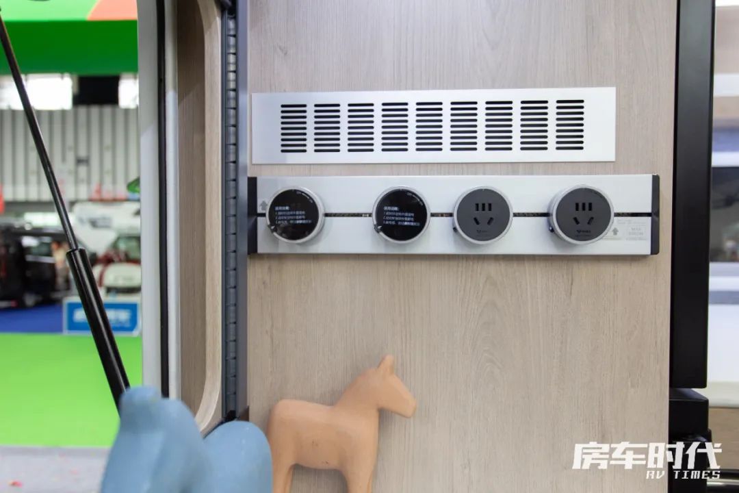 橱柜右侧内嵌有一台152L车载冰箱,可将食物冷冻冷藏收纳。橱柜侧面为整车的中控系统,方便进出时操作。
