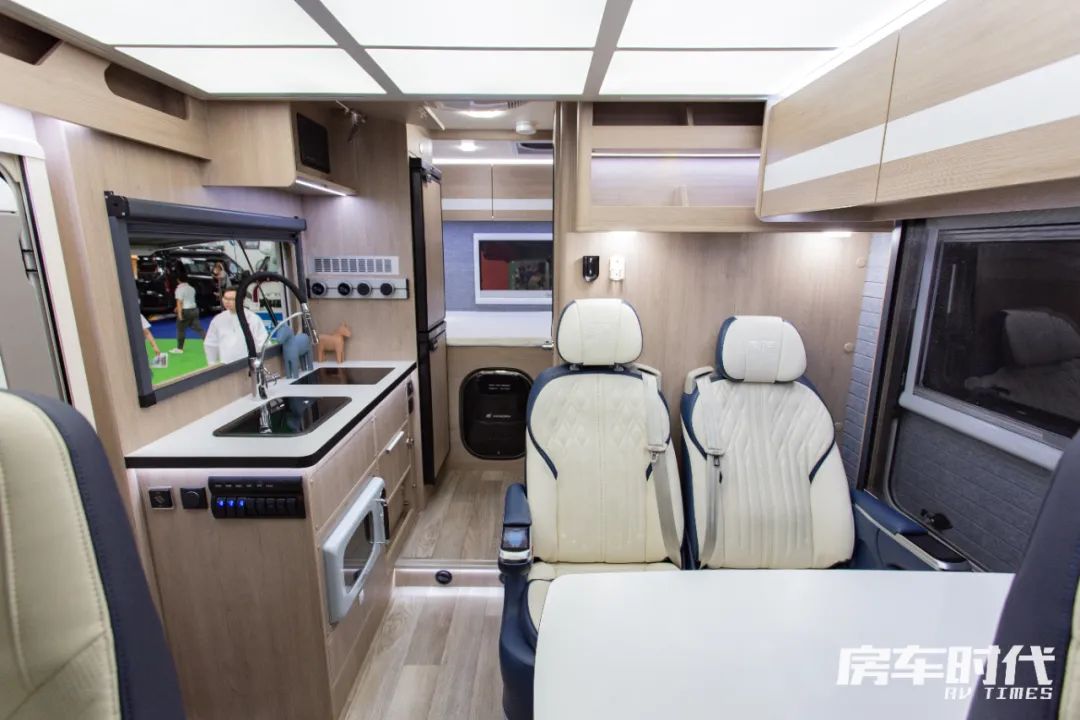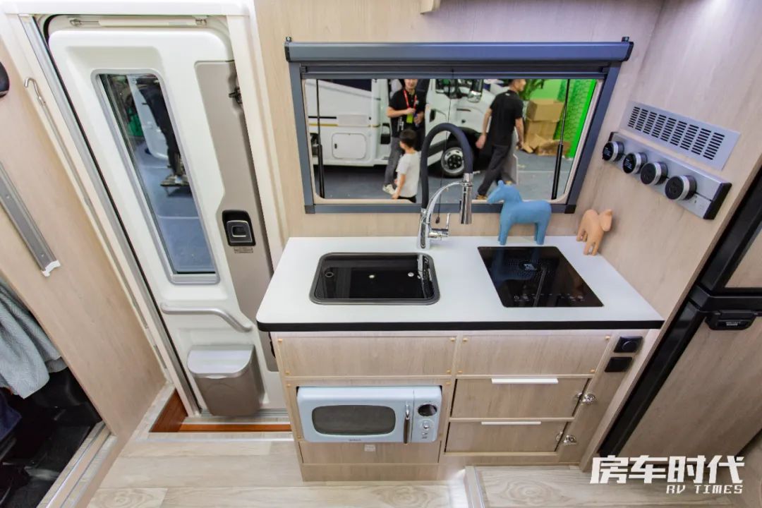 厨房区配置齐全,操作台面上配备有方形带盖水池以及内嵌式电磁炉,顶部设有抽油烟机,避免车内制餐油烟堆积。