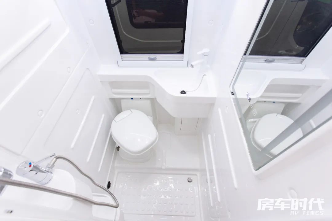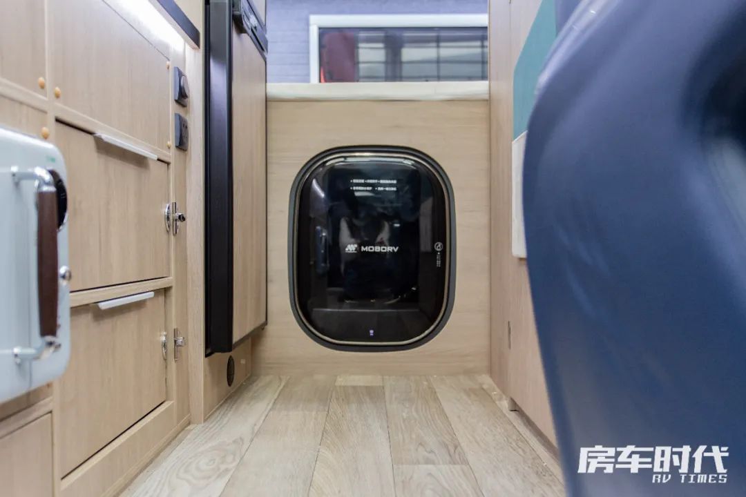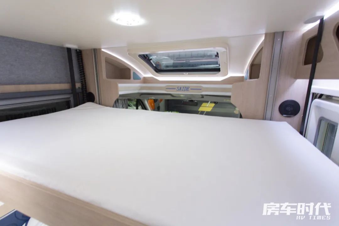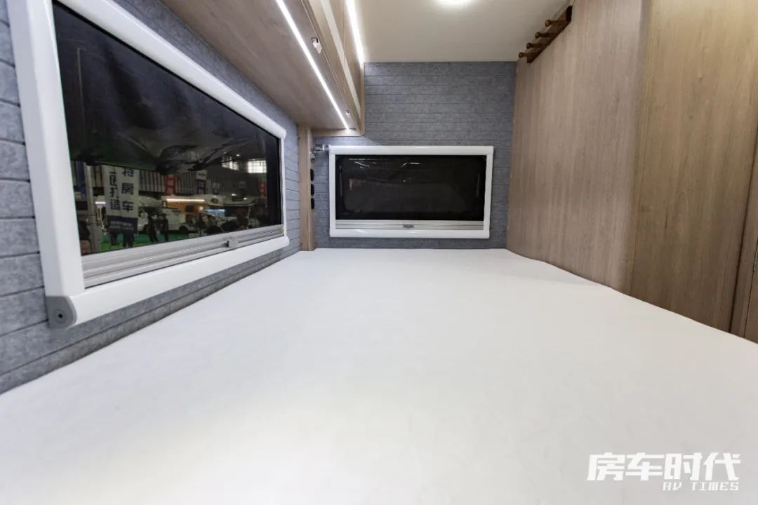 车尾为固定睡卧区,标配有乳胶床垫,能够满足两位成年人的睡卧需求。床铺三面设计有窗户,区域内还配置了挂衣钩、阅读灯、电源接口,符合居家的生活习惯。床铺下面内嵌有一台莫博3kg洗衣机,清洗衣物更加方便,轻松实现清爽旅居。